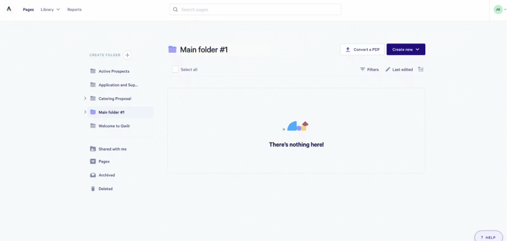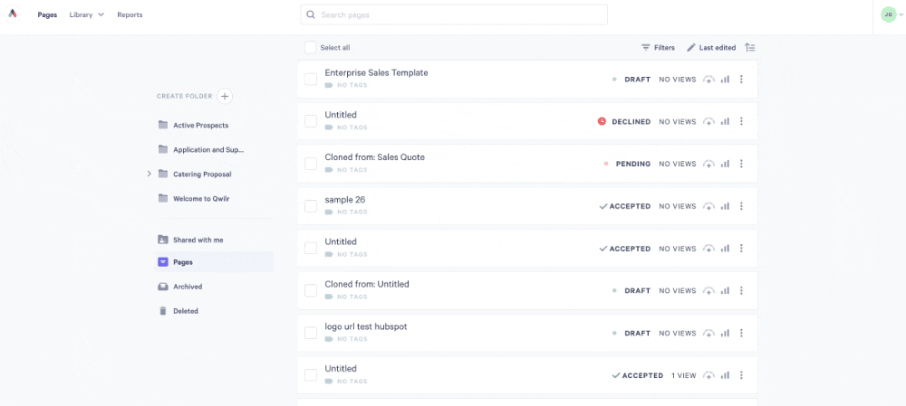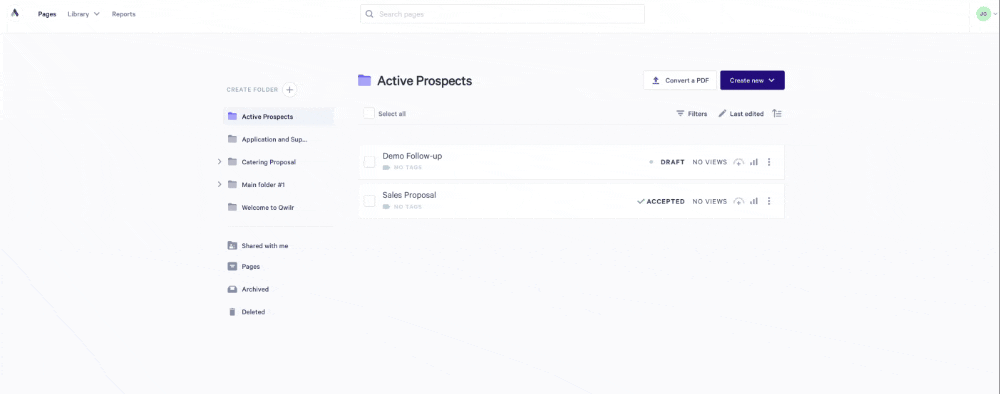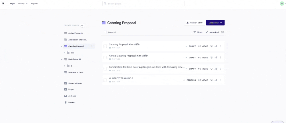When you create a page from a template using HubSpot or Salesforce, Qwilr can automatically save that page into a specific folder.