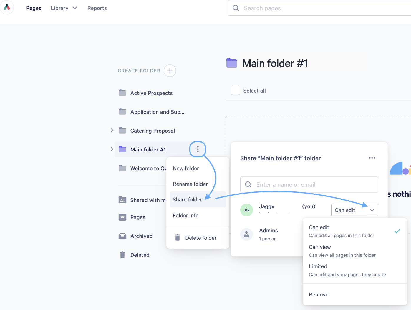 Note: All admins can edit all pages and folders in Qwilr by default and cannot be removed from access.