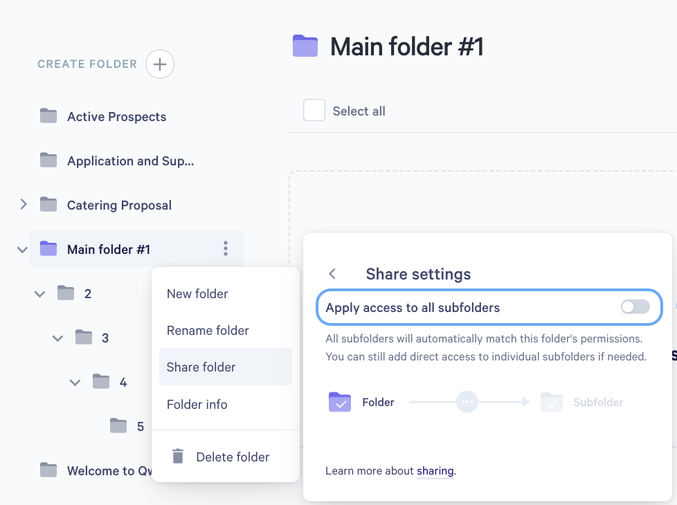 When you create a subfolder, it copies the parent folder’s permissions but after that, it can behave independently. So if you update access on the parent folder, those changes won’t automatically apply to subfolders unless you choose to apply them.