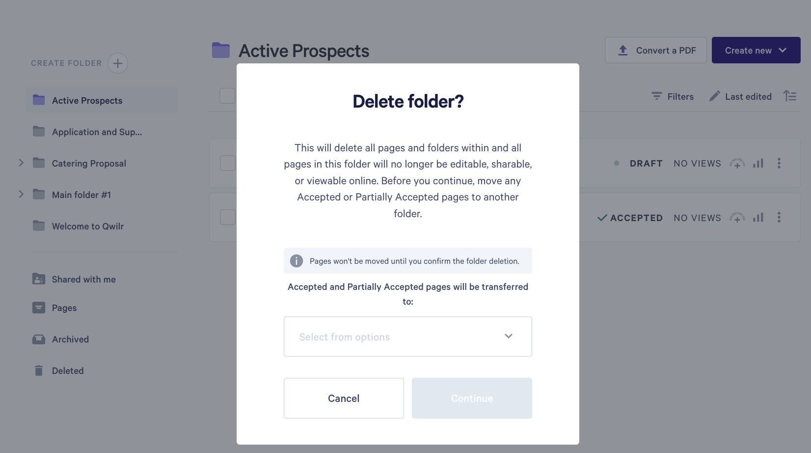 You can delete folders with accepted pages, but you’ll be prompted to move accepted pages to a new folder first as accepted pages cannot be deleted from Qwilr.