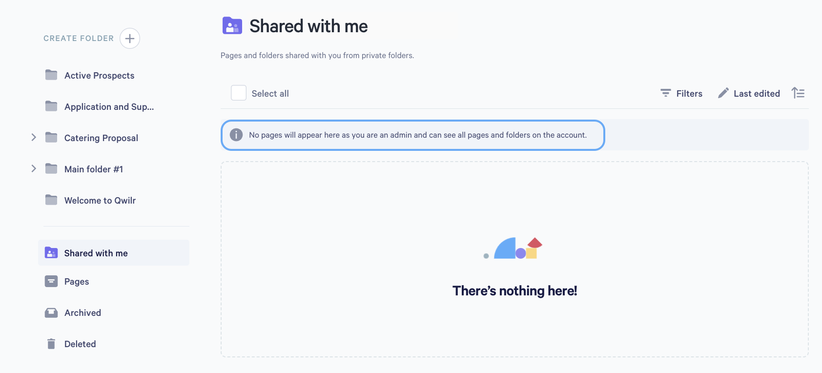 Note: Admins have access to all pages and folders, so the Shared with Me folder is empty for admins.