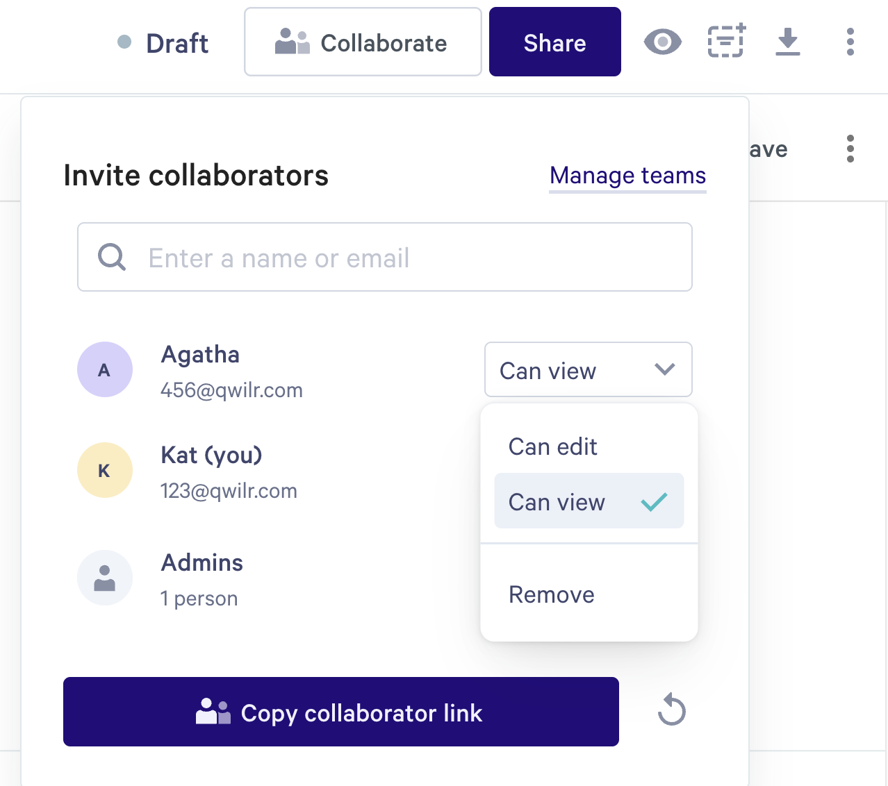 Qwilr has three ways to share internally, depending on the amount of access you need your colleague to have. For team members that are in the Qwilr account with you there is the option to provide either View-Only or Edit Access. For team members that aren't part of your account, you can just share the Collaborate link.