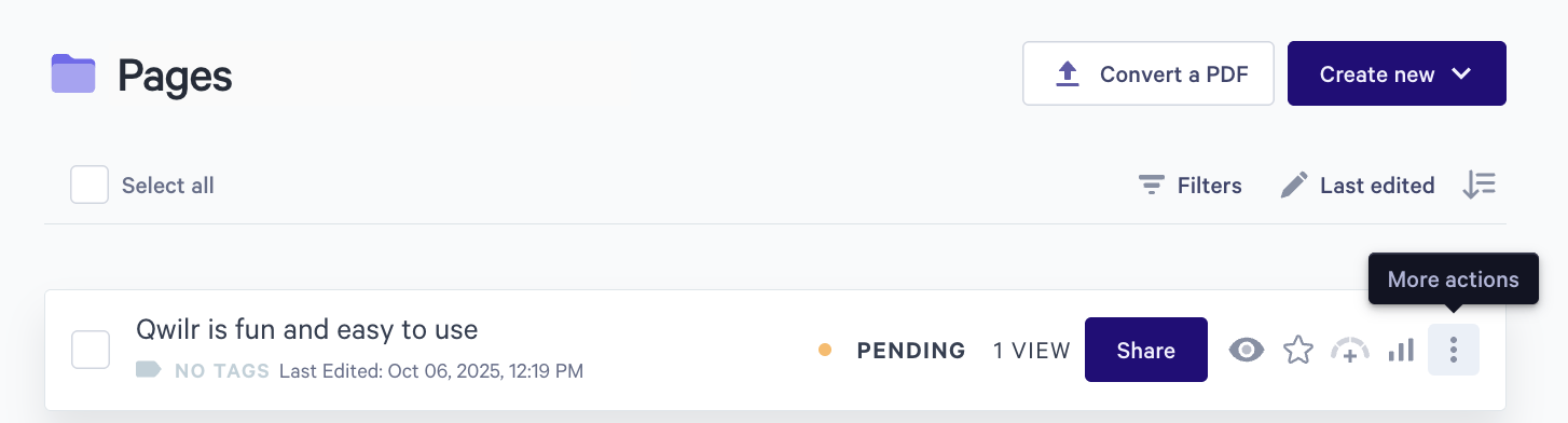 Alternatively, while you're editing a Qwilr Page you can head to the top right corner and click on the More Actions icon (three dots). Then choose Clone.