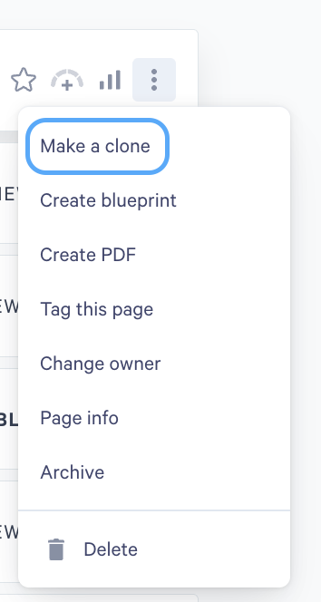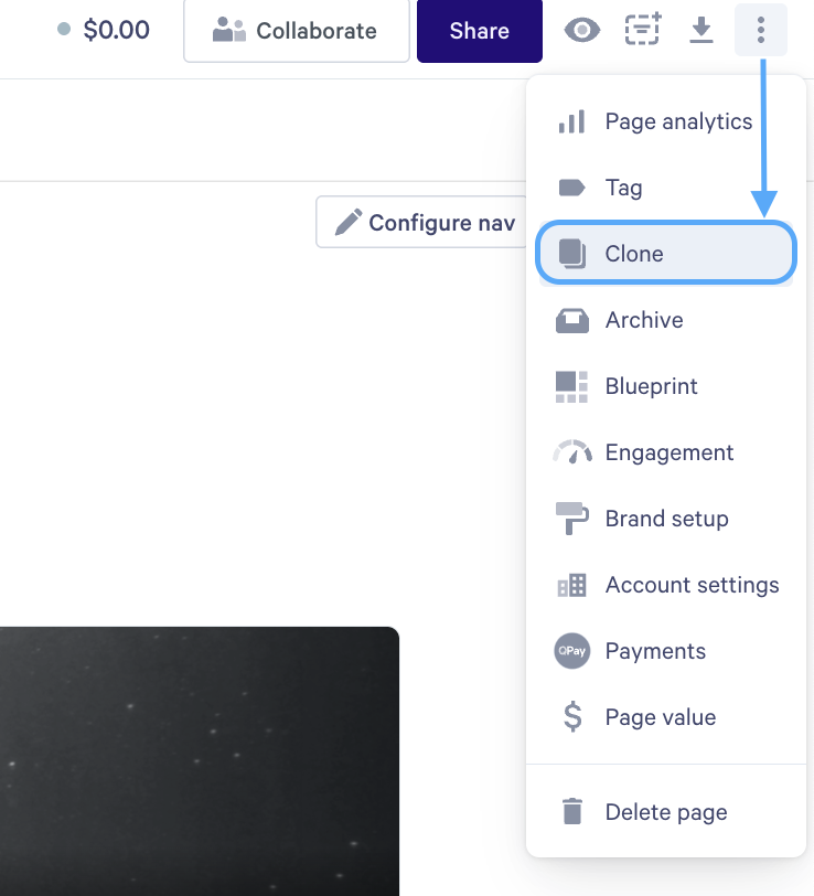 From your dashboard, go to the page you want to clone and click the More Actions icon (3 dots). Then choose Make a Clone from the drop-down menu.