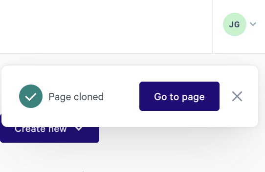 You'll see a notification in the top right corner of the editor. Click Go to Page if you'd like to open the new clone. Or if you'd rather keep working in the original, you can dismiss this notification.