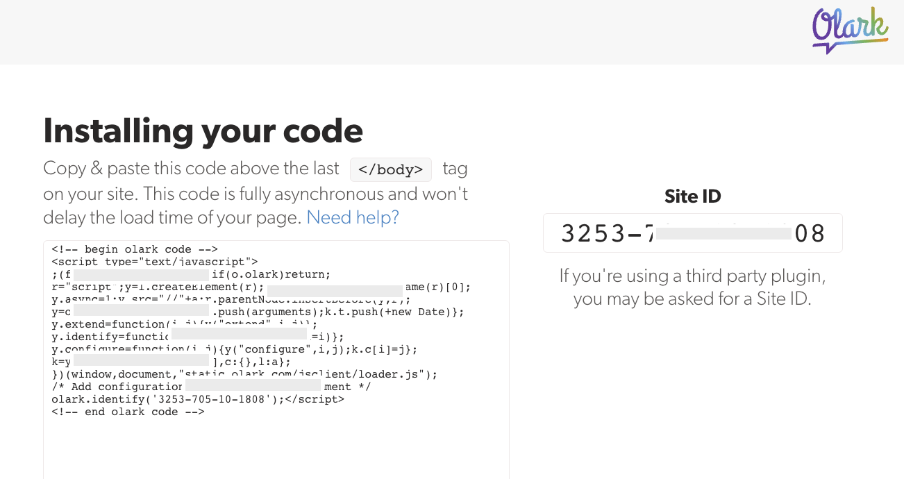 Step 1: Log into your Olark account and head to https://www.olark.com/settings/code. From there you can copy your Site ID from the box.