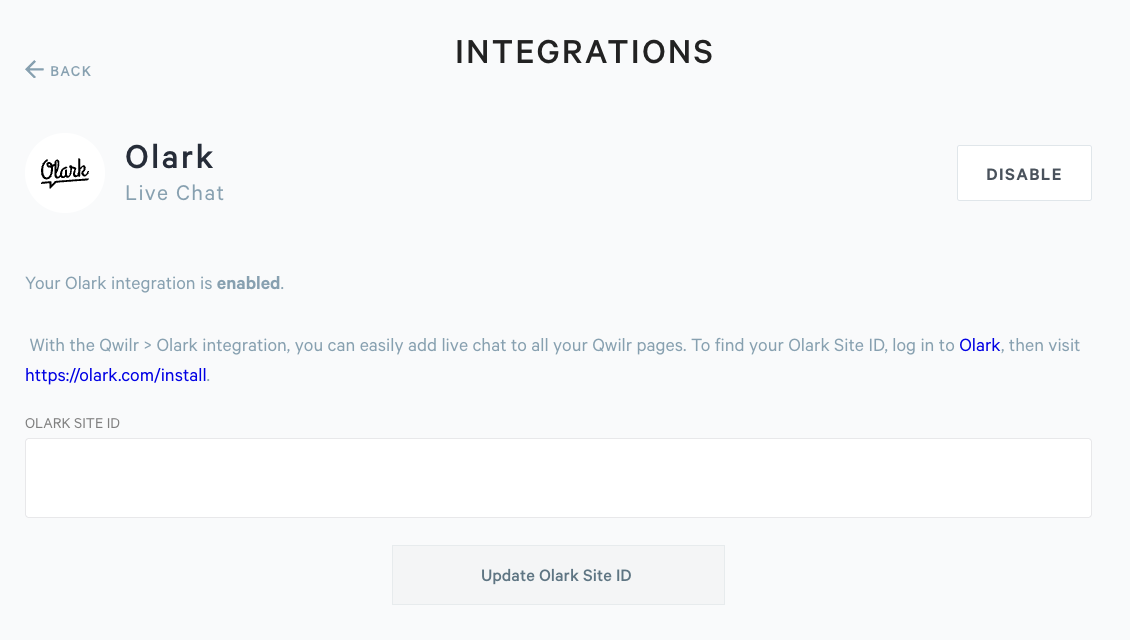 Step 4: Take the Site ID you copied from the Olark page and paste it into Qwilr integration settings. Then click Update Olark Site ID.